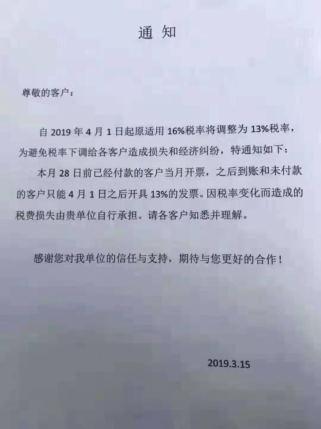 關于增值稅新稅率執行時間,剛剛總理正式通知!增值稅稅率16%降13%,10%降9%,6%擴抵。4月1日起正式開始執行!以后開發票要有大變化了。