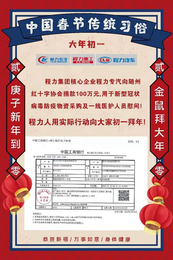 導(dǎo)讀:湖北程力集團(tuán)向隨州市紅十字會捐贈人民幣100萬元,用于抗擊新冠肺炎疫情。此外,該公司正在抓緊調(diào)配設(shè)備,趕制負(fù)壓救護(hù)車,助力早日打贏這場沒有硝煙的戰(zhàn)爭。“各…