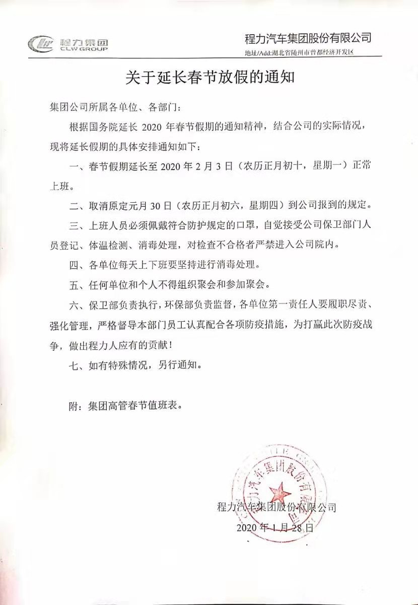 湖北程力汽車集團關于延長2020年春節放假通知