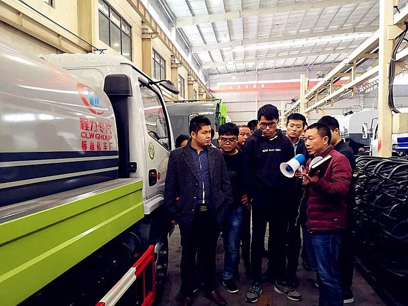 程力環(huán)衛(wèi)車標(biāo)準(zhǔn)化廠王成廠長向?qū)W員們講解程力新標(biāo)準(zhǔn)水車的生產(chǎn)工藝流程。
