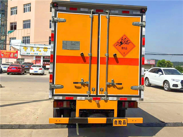 2、廂體分為兩部分:A:運輸炸藥;B:運輸雷管(抗暴容器);C:炸藥,雷管同時運輸(廂體必須隔倉,分倉運輸,加裝抗爆容器)。廂體為雙層金屬骨架結構,外部為冷扎鋼板,內壁采用鋁合金板蒙面,夾層為隔熱阻燃材料填充。設置對開門,如需安裝抗暴容器則增開側門,側壁設有防雨功能自然通風窗口,以使廂內外空氣流動,廂體內部做防靜電處理,廂體底部與廂內前部鋪有阻燃導靜電膠板,并與底盤等電位連接,通過車輛后端的導靜電裝置與大地相連,可防止靜電火花的產生和車輛靜電及時釋放,提高爆破器材運輸車的安全性。廂體內部前面和側面裝有固定拉環,與捆綁帶使用捆綁貨物以避免移動,保證安全。