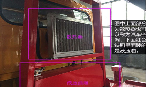 圖中上面部分為散熱器也可以稱為汽車空調,下面紅色鐵廂里面裝的是液壓油。散熱器主要給上裝所有油路管散熱,防止油管加快老化。液壓油廂里的液壓油供給上裝部分所有液壓操作部分使用。