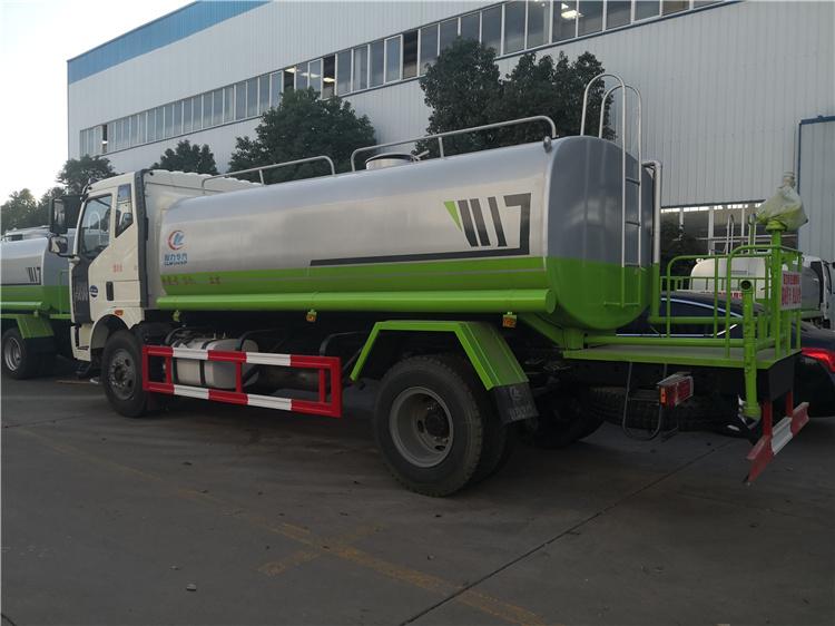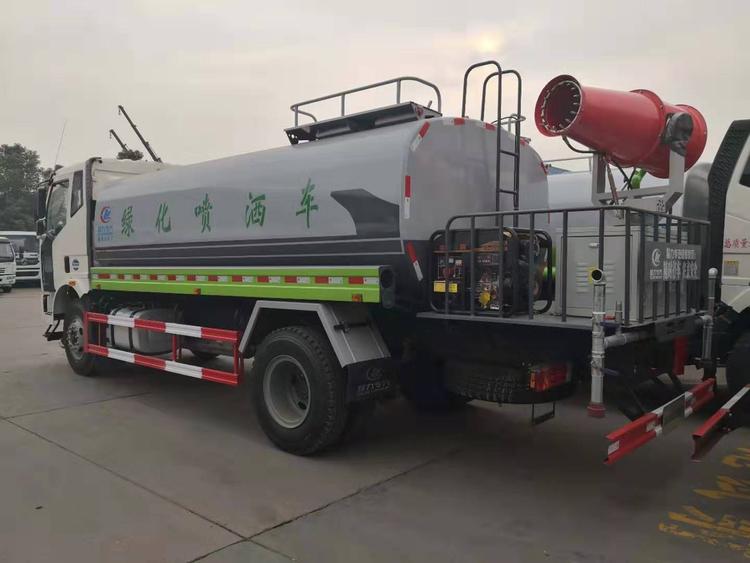 改裝配置:罐體用4MM碳鋼板制作,罐內隔板具有防波作用,以減低汽車行駛時罐體液體的沖擊。整車帶一個專用灑水泵(垂直最大吸程6米),灑水寬度14米,射程28米。多功能灑水車配備2個前沖(噴)(能將路面泥巴、塵土、垃圾沖干凈);2個后灑(能均勻地將水灑在路面,一次灑水寬度14米)、2個側噴(花灑)(能均勻地將路旁綠化帶澆灌)、帶1個后工作平臺,平臺上安裝1個綠化灑水高炮(灑水炮可全方位旋轉,可連續調成直沖狀、大雨、小雨、毛毛雨,霧狀可調節沖洗高大樹木),引水時間<5min,流量90m3/h。帶1個消防接頭,帶1個自流閥,1個過濾裝置、人性化爬梯及側防護欄,安裝灑水音樂喇叭。